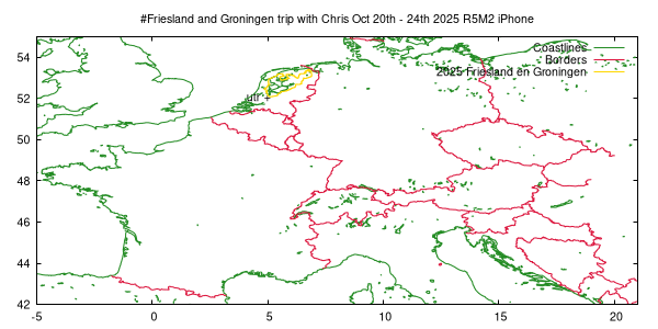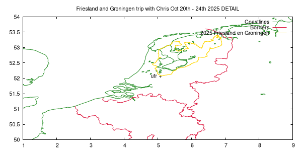 set xrange [1:9] set yrange [50:54] set tit "Friesland and Groningen trip with Chris Oct 20th - 24th 2025 DETAIL" replot |