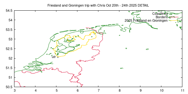 set xrange [3:11] set yrange [50.5:54.5] set tit "Friesland and Groningen trip with Chris Oct 20th - 24th 2025 DETAIL" replot |