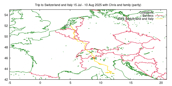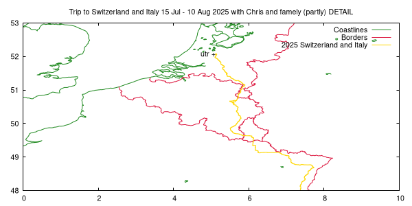 set xrange [0:10] set yrange [48:53] set tit "Trip to Switzerland and Italy 15 Jul - 10 Aug 2025 with Chris and famely (partly) DETAIL" replot |