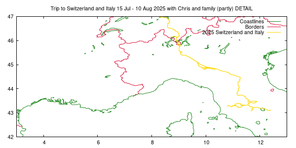 #set xrange [6.5:12.5] #set yrange [42.5:45.5] set xrange [3:13] set yrange [42:47] set tit "Trip to Switzerland and Italy 15 Jul - 10 Aug 2025 with Chris and family (partly) DETAIL" replot |